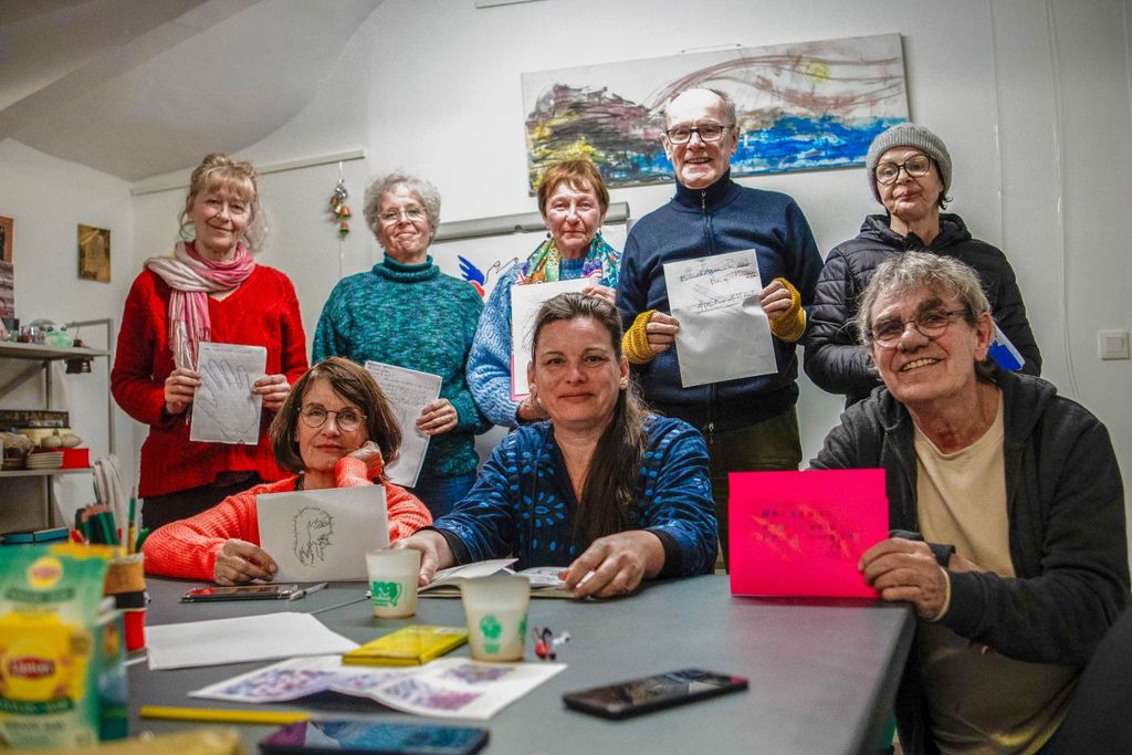 Aujourd’hui, Catherine, pull bleu, écharpe en soie turquoise avec motifs, Sophie, qui a gardé son bonnet gris avec pompon, et une dizaine d’autres participants ont découvert aujourd’hui le thème proposé : « Art et écriture, quand l’art visuel et l’écriture ne font qu’un. » L’animatrice propose de suivre ce thème en travaillant sur le haïku, ce poème d’origine japonaise extrêmement bref, né au 17e siècle. « Il s’agit d’une juxtaposition d’images guidée par l’émotion et pas par la logique, qui évoque la nature en trois vers, un court, un long, un court. »