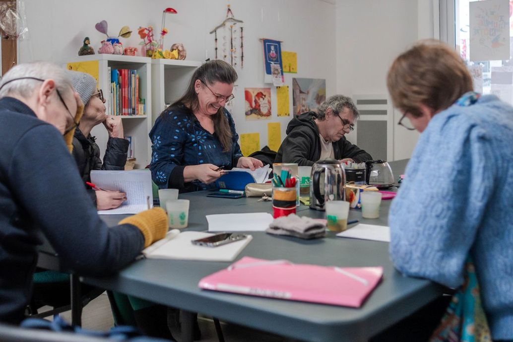 Annick, pull en laine bleu et vert, se lance. Elle lit son haïku qui parle de pleines lunes et d’insomnie, « parce que je ne dors pas les nuits de pleine lune », précise-t-elle. L’exercice a inspiré tous les participants qui évoquent une « grotte sombre » (Sophie), un « ciel qui rougit » (Christian) ou un « arc-en-ciel qui inonde l’horizon » (Dominique). Les questions fusent. Les bénévoles se sont attachés à instaurer un climat de confiance dans lequel chacun peut évoquer des souvenirs personnels, des éléments qui le touchent, en sachant que personne ne sera jugé. « C’est un équilibre. On fait circuler de la bienveillance, mais je fais aussi en sorte que personne ne soit emporté par l’ambiance à confier des choses qu’il regretterait après. » Des liens se tissent en fonction des affinités. Des amitiés naissent, un couple s’est même formé.