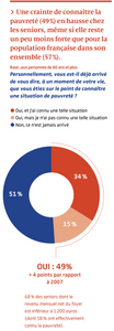 Le phénomène inquiète : aujourd’hui, près d’un senior sur deux (49 %) s’est déjà dit qu’il était sur le point de connaître la précarité. C’est un peu moins que pour l’ensemble des Français, mais cette inquiétude a augmenté de manière significative chez les plus âgés par rapport au premier baromètre Ipsos-SPF en 2007 (+4 points).