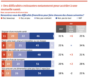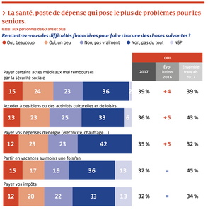 Dans un tel contexte, comment s’étonner que près d’un senior sur deux déclare ne pas parvenir à équilibrer son budget ? Ces difficultés financières influent en particulier sur leur accès à la santé. Ils sont 39 % à avoir le plus grand mal à payer certains actes mal remboursés par la Sécurité sociale et 31 % à financer une mutuelle, soit une augmentation notable de 6 points par rapport à l’année dernière.