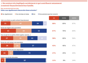 Beaucoup consacrent aussi leur temps aux autres, que ce soit pour leurs petits-enfants ou pour une association. Plus d’un quart (27 %) s’occupent d’une personne dépendante, dont 16 % régulièrement. Impliqués socialement, contribuant à soutenir leur famille, les seniors sont inquiets de devenir une charge pour elle : 56 % redoutent de ne pas pouvoir faire face à leur propre dépendance ; les plus pauvres sont 74 % à nourrir cette angoisse.