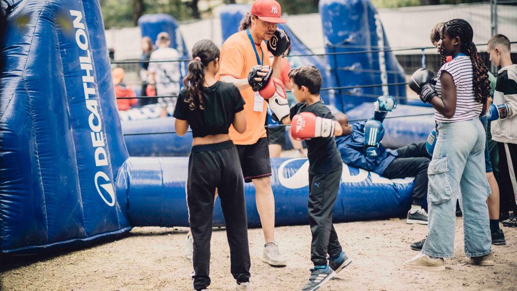 En circulant à “la plage”, au milieu de cette marée humaine, des éclats de rire et de la nuée de casquettes multicolores, on peut voir se dérouler des parties de basket, non loin d’une initiation à la boxe anglaise – « là, tu lances ton coup droit et tu enchaînes par un crochet en pivotant bien sur la pointe de ton pied avant » – tandis qu’à côté une file joyeuse de filles et de garçons s’est formée pour monter, par la droite, en haut d’une pyramide gonflable, dans le but de descendre, par la gauche, sur un toboggan.