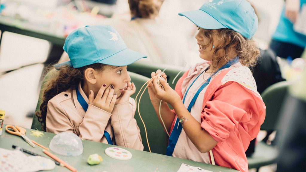 « Je mets beaucoup de paillettes rouges et dorées », décrit Grace, 8 ans, qui s’est levée tôt pour venir de Toulouse au Champ-de-Mars, ce 20 août. Alors que la musique de la grande scène centrale se fait de plus en plus entendre, la petite s’est arrêtée avec ses copines au stand de loisirs créatif : elle décore, à sa guise, une petite plaque de bois de la taille d’une médaille.