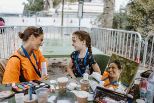 Un peu plus loin, Helena, Acile et sa sœur Hadil font la queue au stand de photos. Elles sont toutes passées d’abord à l’atelier maquillage. Helena, une étoile sur une joue et un oiseau sur l’autre, raconte à ses copines les parties de tir à la corde qu’elle vient de faire et s’enthousiasme pour le petit mur d’escalade sur lequel elle est montée, même « si c’est dur un peu ».