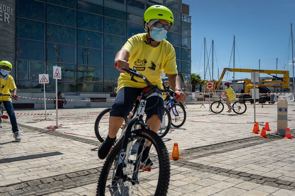 Sur leurs BMX gris, Margaux, Marwa et Mélyne arborent chacune le fameux maillot jaune du Tour de France, mais siglé cette fois du logo du Secours populaire et de celui d’Amaury Sport Organisation, l’organisateur du Tour. Sur l’esplanade Éric Tabarly, placée entre le grand Aquarium de La Rochelle et l’un des bassins du vieux port, elles s’élancent tour à tour sur les trois circuits mis en place par les bénévoles du Secours populaire, du club de BMX de la ville et de la prévention routière. Elles pédalent entre les plots rouge, vert et bleu, passent les bosses en carbone en se levant de la selle et reviennent à leur point de départ, avant de recommencer. « J’adore. Je ne connaissais pas le BMX. J’y retourne », s’exclame en passant Mélyne, 10 ans, dont les yeux lancent des éclairs de satisfaction.