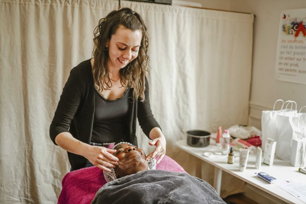 Encore un peu endormie, Ruth a les yeux qui brillent. « J’ai l’habitude de m’occuper des autres, de ma mère qui est malade et de mes deux enfants, mais je m’oublie au passage. Et je ne suis pas seule dans ce cas. Sans papier pour le moment, je ne peux pas travailler. Chaque soir, je me pose la question de comment sera la journée du lendemain… Ce soir, je vais bien dormir parce que Marielle s’est bien occupée de moi. » La jeune femme de 34 ans, originaire du Congo, sort d’une séance de près d’une heure de soins du visage et de massages prodigués par Marielle, une esthéticienne professionnelle qui donne quatre heures de son temps tous les mois au comité de Villejuif. Toujours attentive, toujours souriante, cette dernière y met tout son savoir-faire et sa bienveillance. Elle passe d’abord « une lotion micellaire pour nettoyer le visage », puis procède au « gommage pour éliminer les cellules mortes », et pose enfin « un masque pour nourrir la peau ».